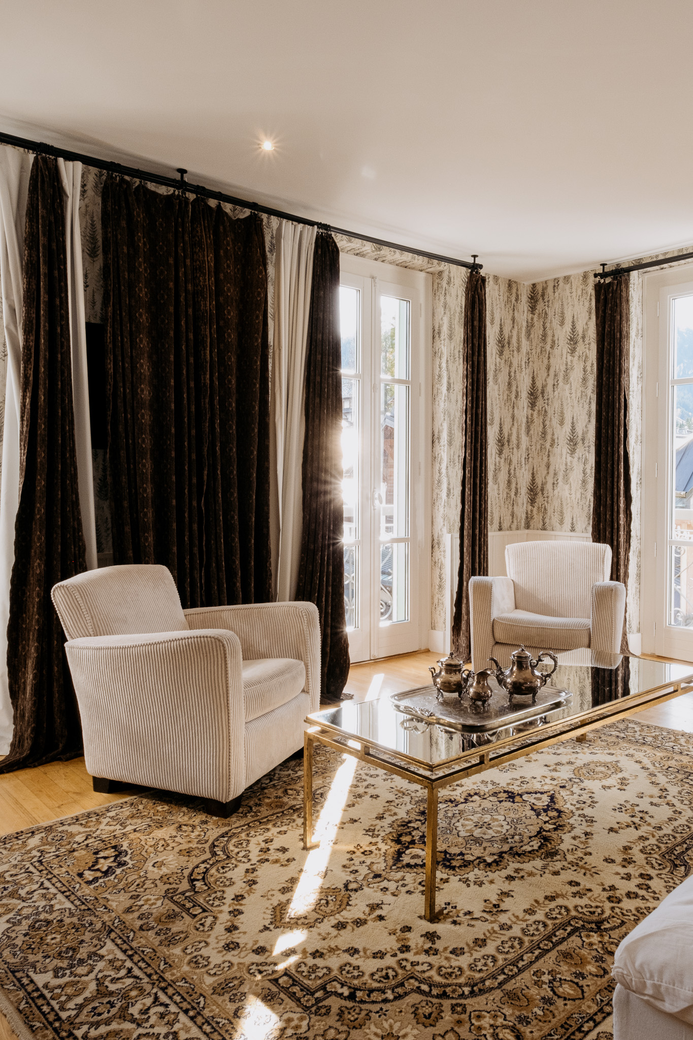Step into the Timeless Suite and surround yourself with the tranquillity of nature. This beautifully designed suite is an ideal retreat for families or groups of friends, offering spacious comfort and a warm, inviting atmosphere. In the bright living room, expansive windows frame picturesque views of forest trails, creating the perfect setting for relaxation and social gatherings.